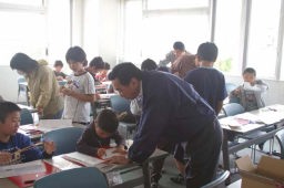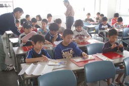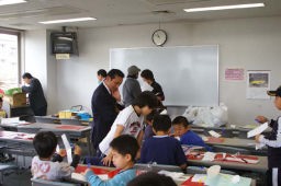 | お友達が ヒコーキを作っているところを 興味深そうに見学しています。 戸張市長さんも ぼくたちと一緒に ヒコーキをつくりたいのかなーー。 |